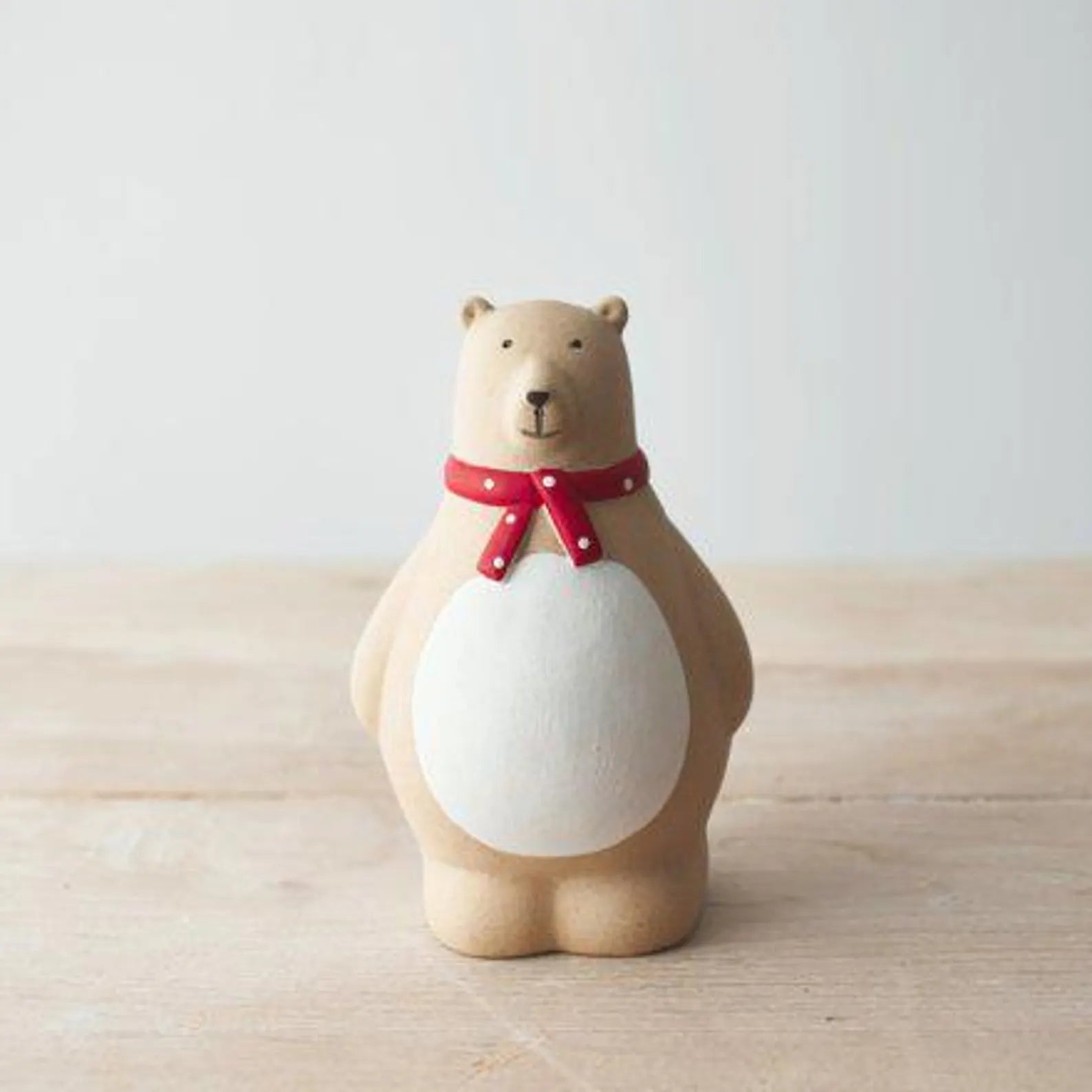 Meet Bernie Bear. A very sweet looking bear ornament with a beige and white body and a red and white polka dot scarf.