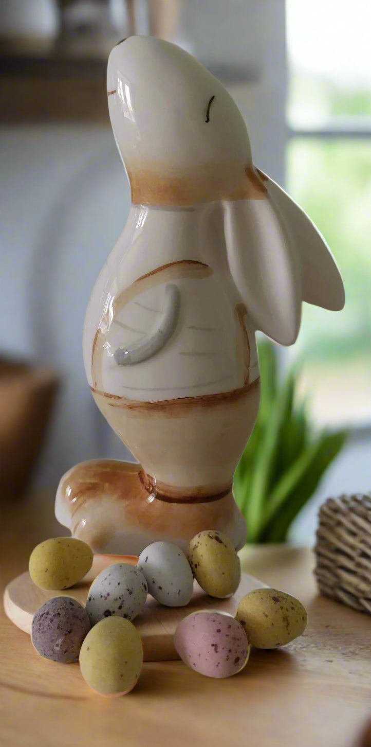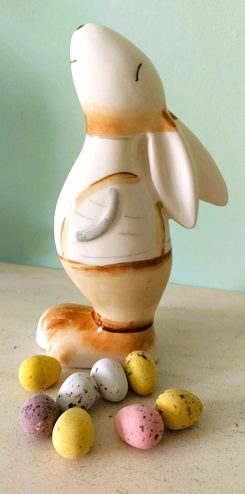 A charming bunny ornament with long pointed ears and a dreaming face. Complete with adorable dungarees. Such a cute little character.