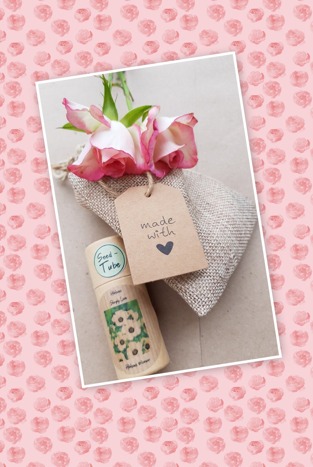 The seed tube comes in a hessian drawstring bag (pink or kraft colour) and a label & sticker of your choice, which can be customised. All favours are packaged with biodegradable shredding and dried petals.